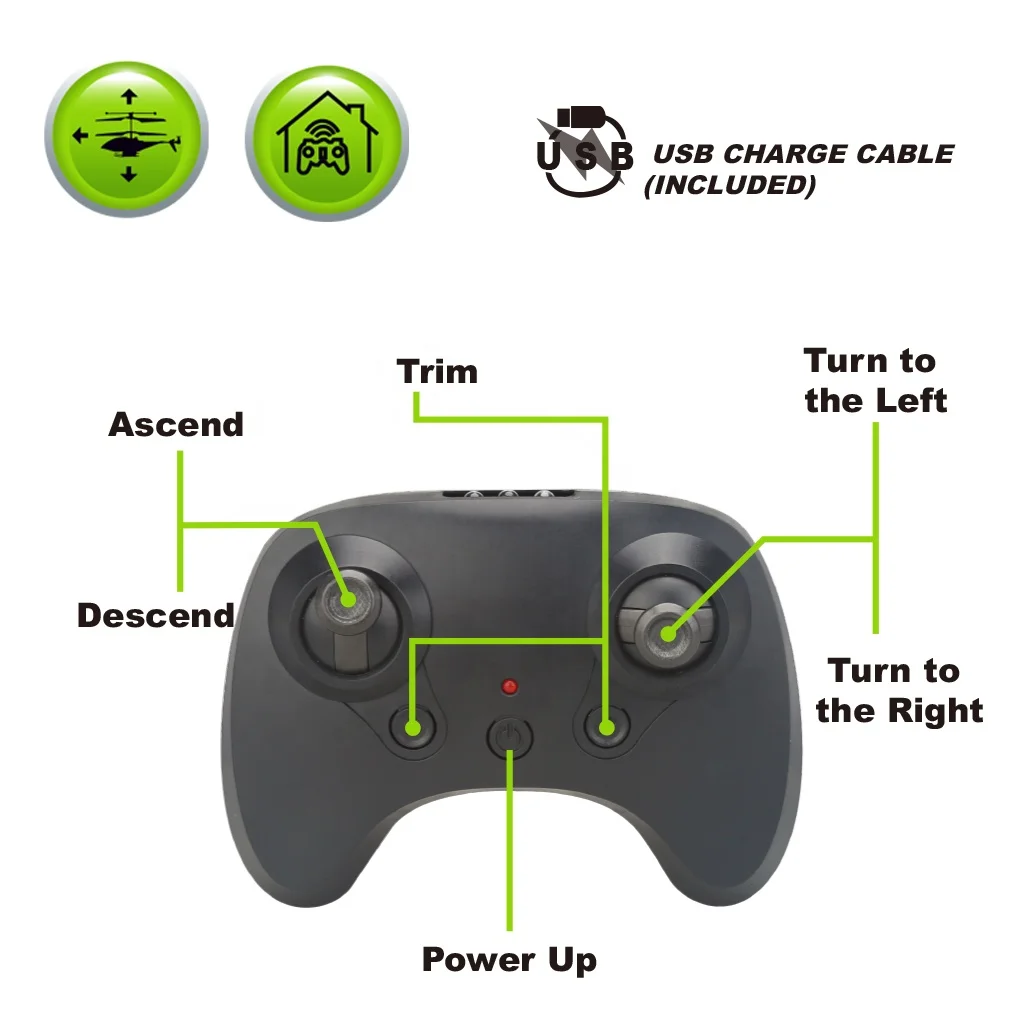 Helicopter: Rechargeable 3.7V 150MAH li-poly battery W/USB charger(included) Transmitter: 3AAA(not included)