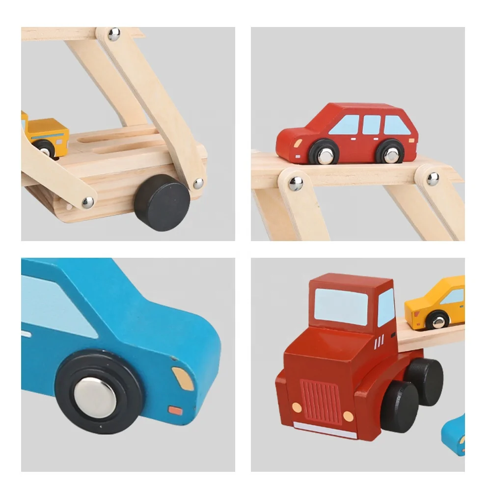 Tierra Feliz - Vehículos de transporte de madera Juguete con 3 coches de colores Camiones de juguete de madera Vehículo transportador Juguetes proveedores de aprendizaje temprano Vehículo de empuje