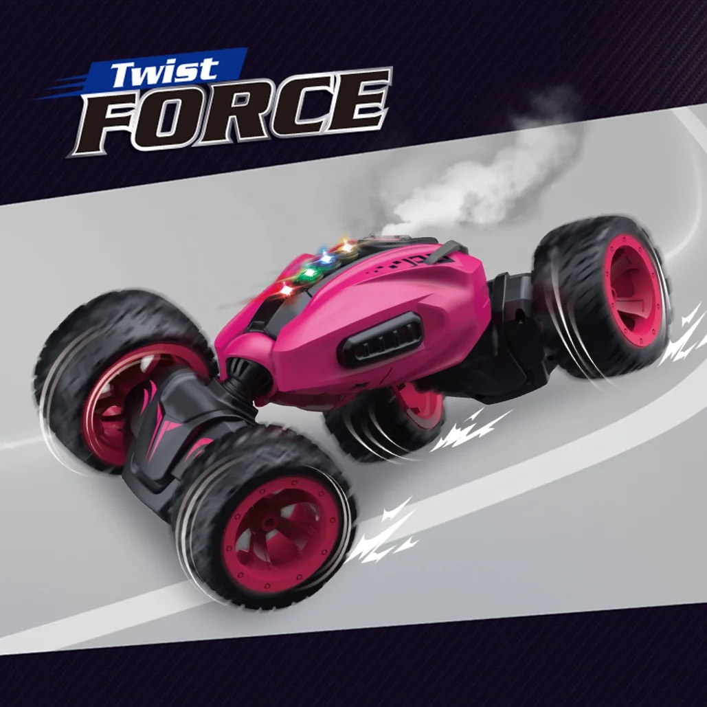 Fast Gearz - Voiture de cascade à commande à distance 2,4 GHz double face avec effet de lumière cool et pulvérisation atomisée pour enfants, jouet RC tournant